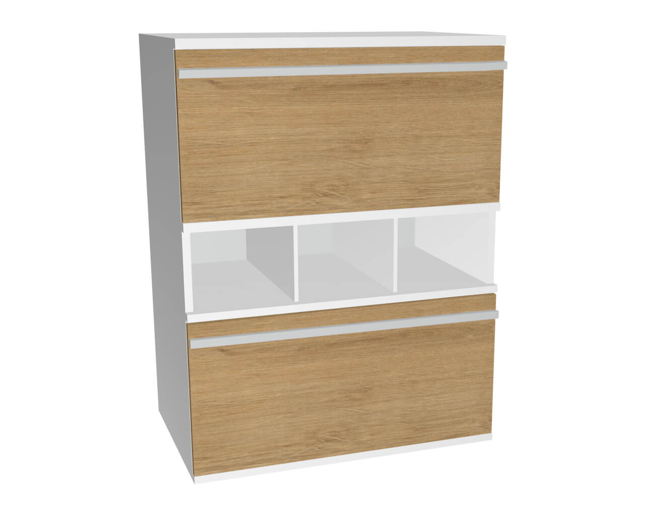 Schrankelement mit offenem Fach und doppelten Klappenschränken mit Öffnung nach unten, Front Wildeiche, Tiefe 52,0 cm, Breite 80,0 cm.