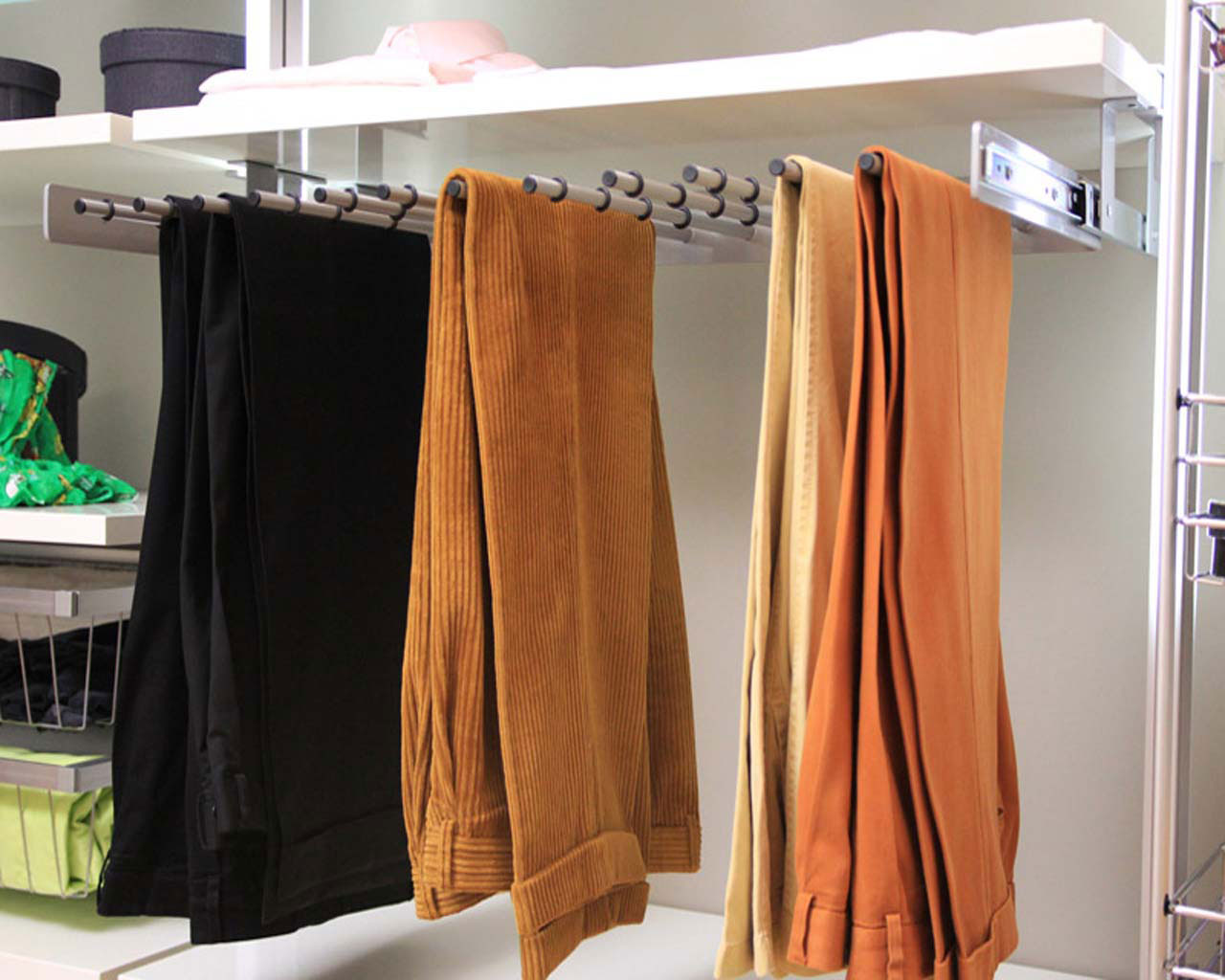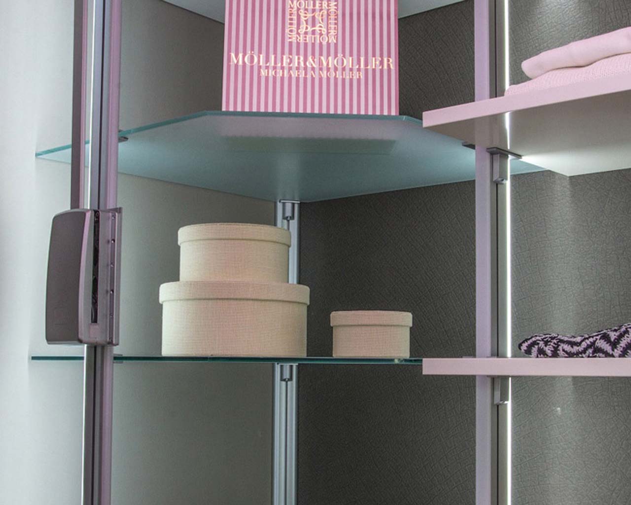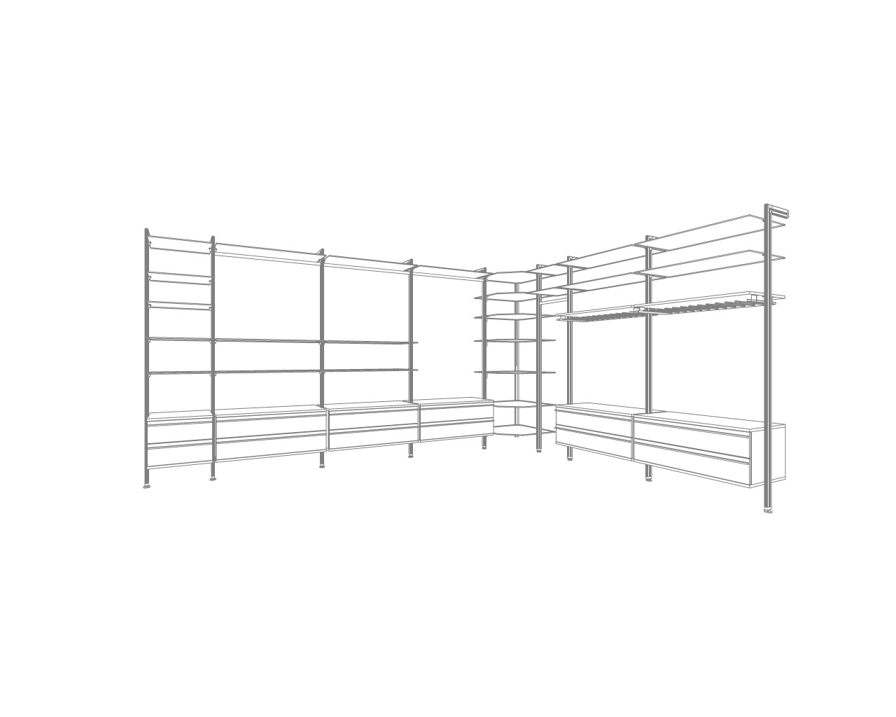 Die Elemente des Boden-Wand-Systems lassen sich beliebig an den Trägerprofilen befestigen. Alle Schubkastenelemente sind mit hochwertigen Unterflurauszügen mit Selbsteinzug und Dämpfung ausgestattet. Mit den umfangreichen Systemkomponenten kann der Kleiderschrank jederzeit ergänzt werden. Ihren Gestaltungswünschen sind somit fast keine Grenzen gesetzt.