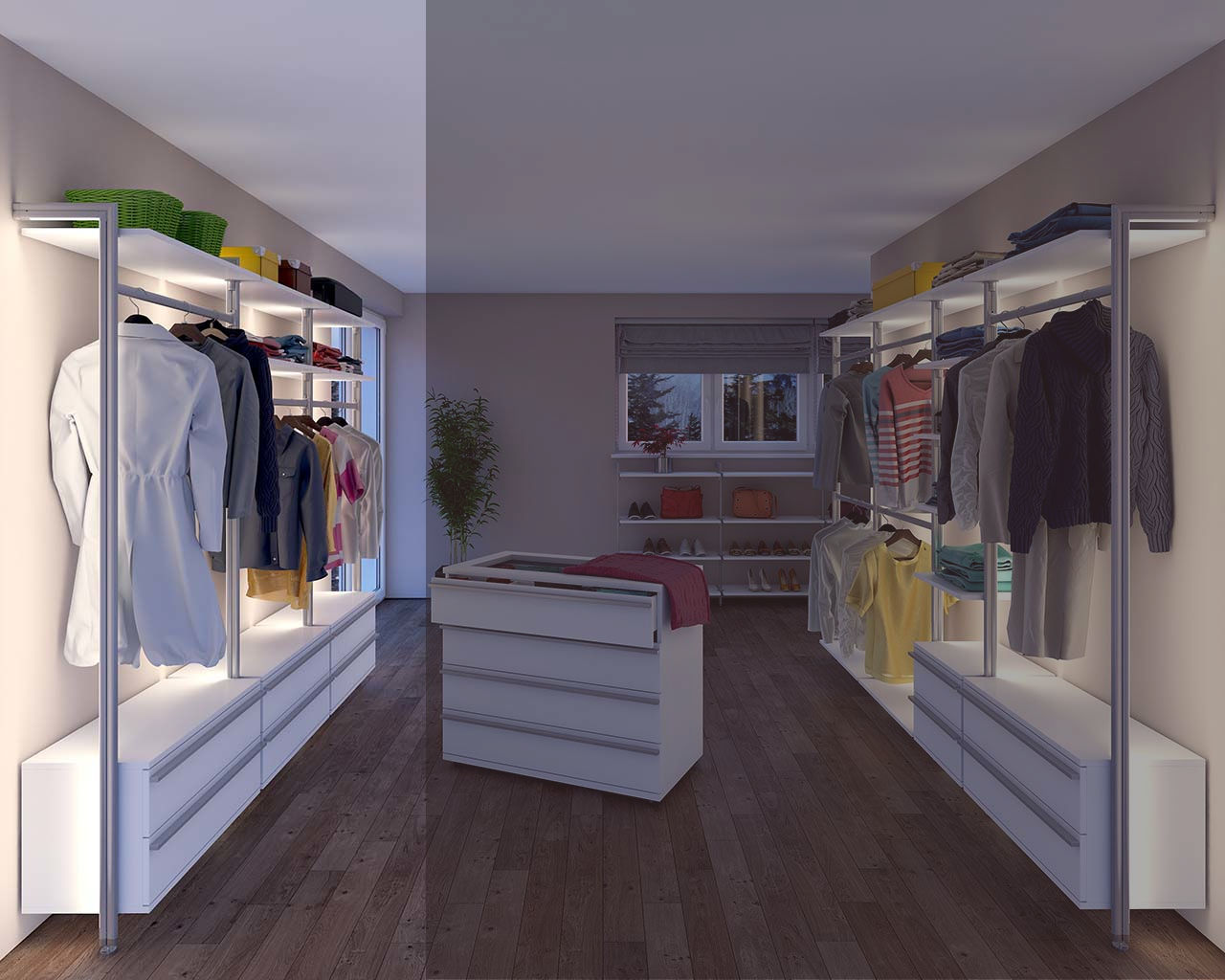 Mit unserer einzigartigen Technik, LED Beleuchtung in die Trägerprofile zu integrieren, verleihen Sie Ihrem Schranksystem das besondere Extra. Ein beleuchteter Kleiderschrank sieht nicht nur gut aus, sondern setzt auch Ihre Kleidung ins perfekte Licht.