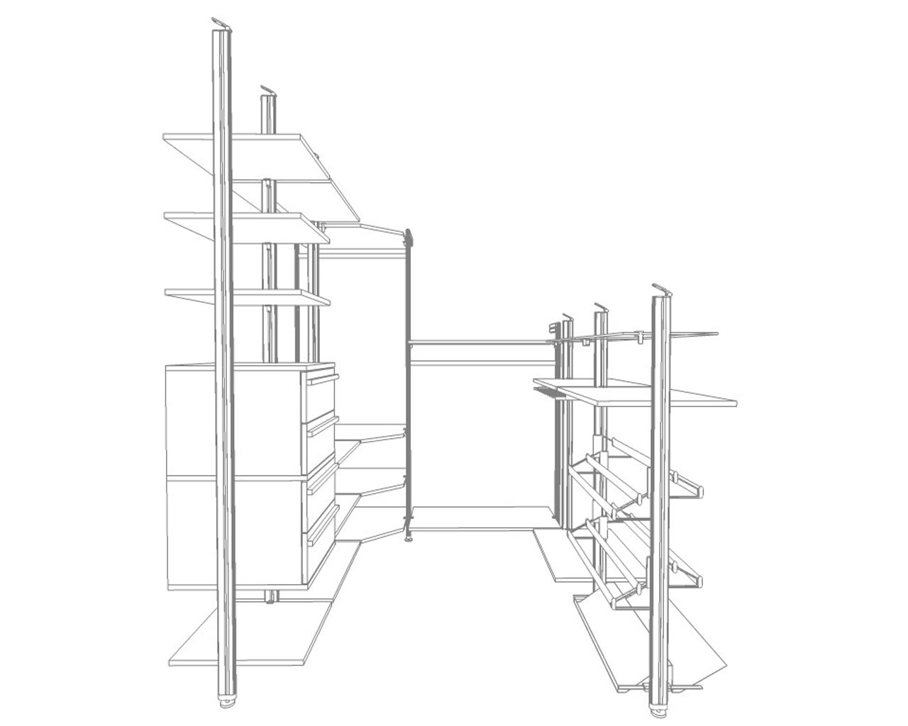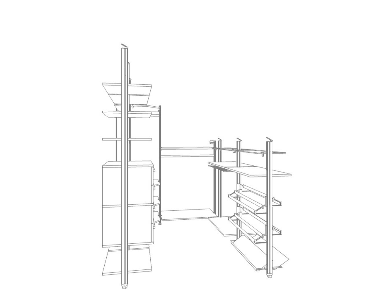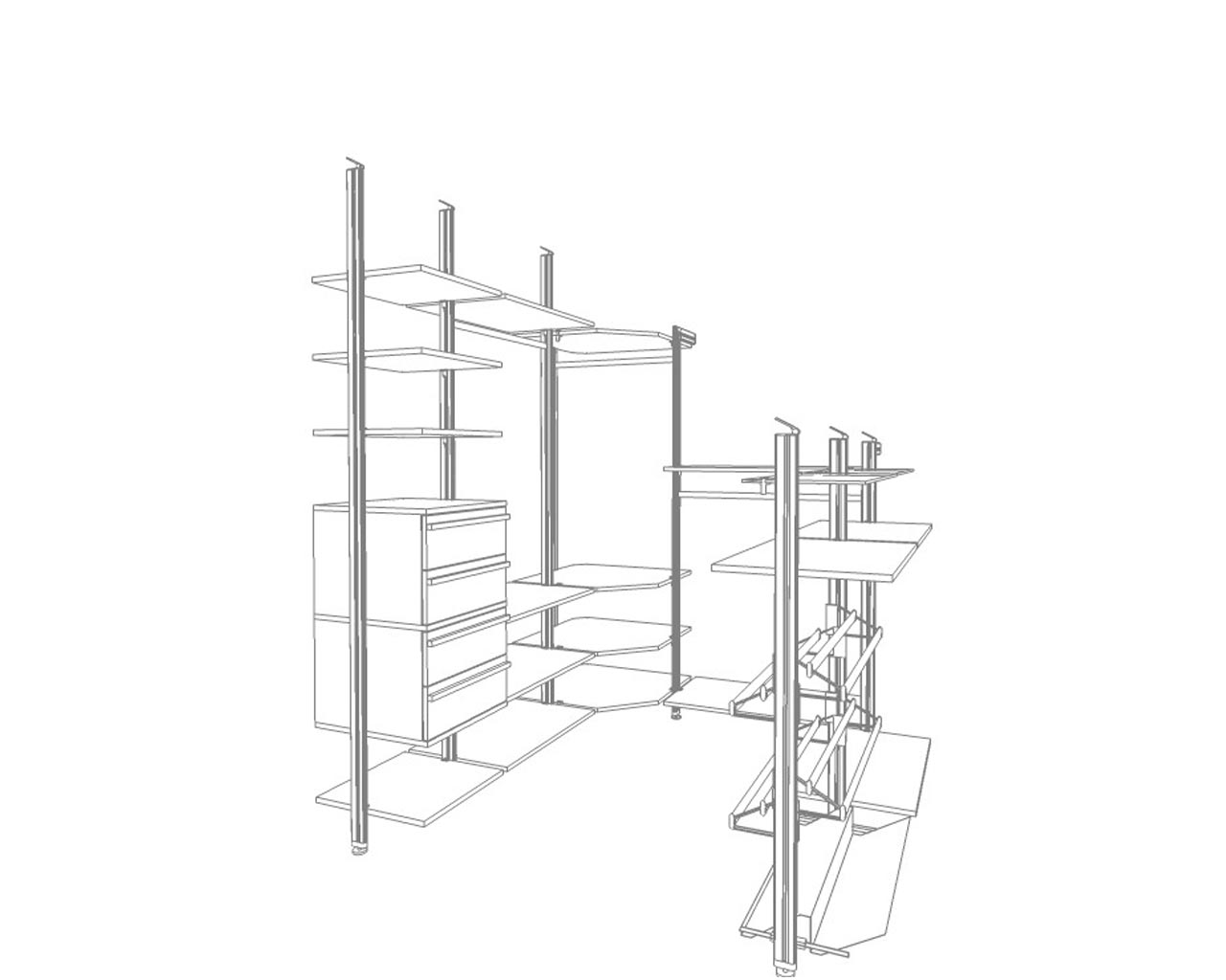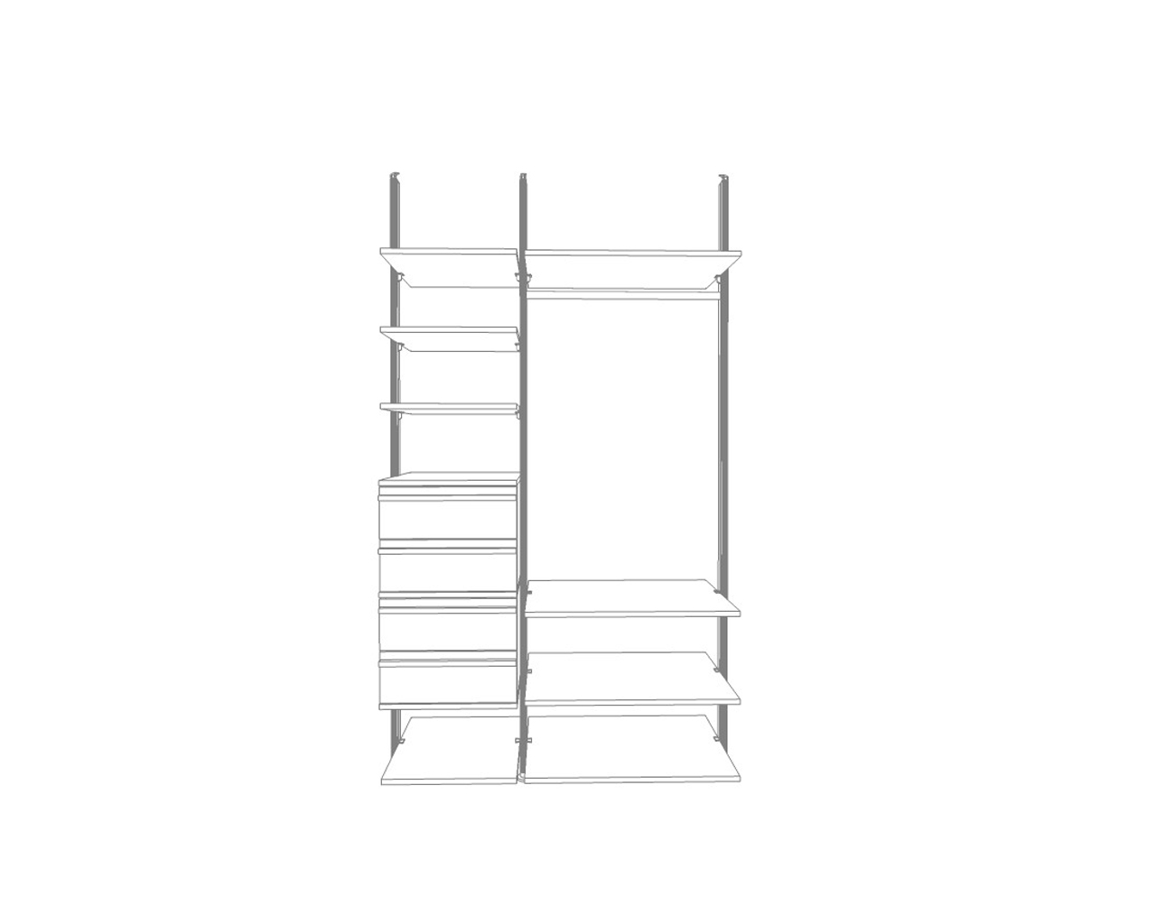 Die einzelnen Funktionselemente wie Böden, Kleiderstangen und Schubladenschränke lassen sich stufenlos an den Trägerprofilen befestigen. Alle Schubkastenelemente sind mit hochwertigen Unterflurauszügen mit Selbsteinzug und Dämpfung ausgestattet.