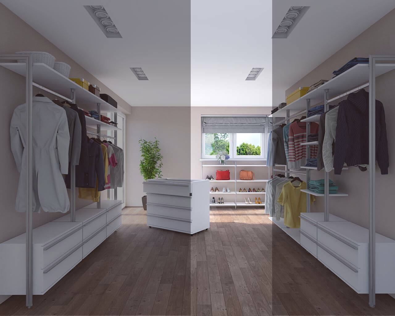 Die einzelnen Funktionselemente wie Böden, Kleiderstangen und Schubladenschränke lassen sich stufenlos an den Trägerprofilen befestigen. Alle Schubkastenelemente sind mit hochwertigen Unterflurauszügen mit Selbsteinzug und Dämpfung ausgestattet.