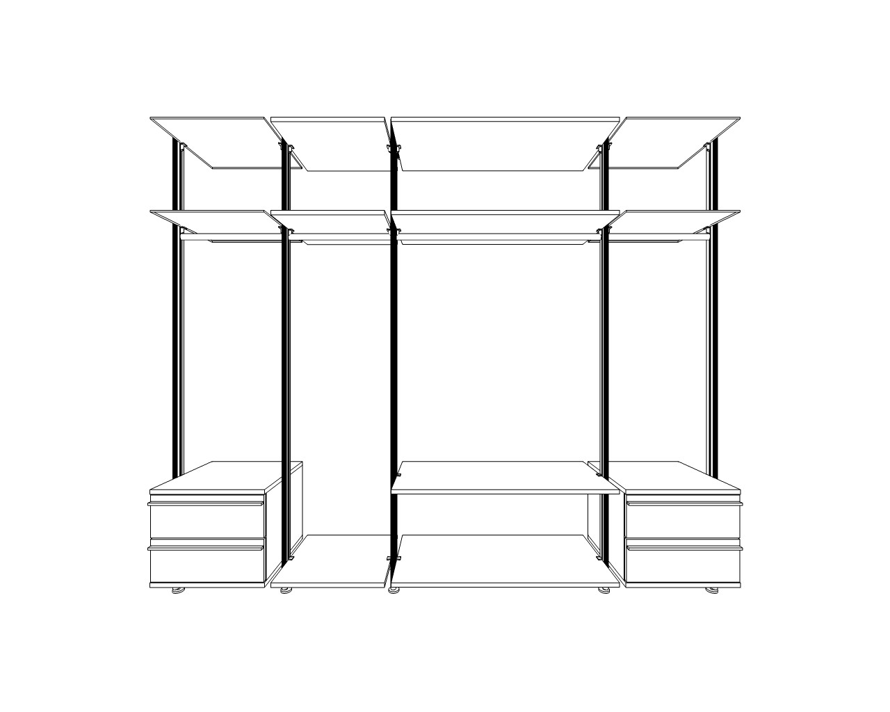 Die Funktionselemente wie z. B. Böden und Kleiderstangen lassen sich stufenlos an den Trägerprofilen befestigen. Alle Schubkastenelemente verfügen über langlebige und hochwertige Unterflurauszüge mit Selbsteinzug und Dämpfung.