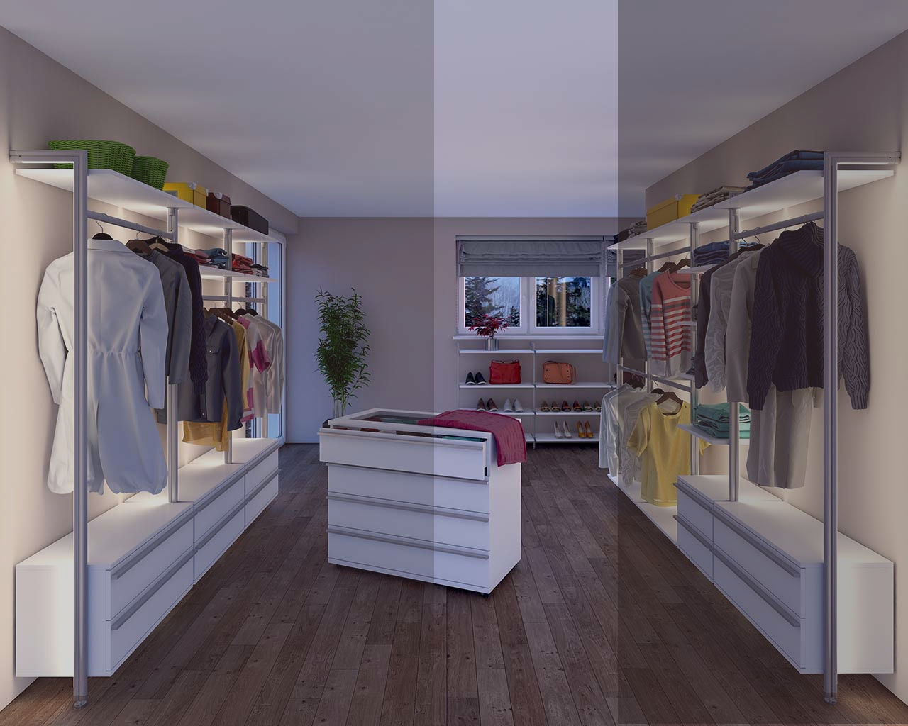 Mit unserer einzigartigen Technik, LED Beleuchtung in die Trägerprofile zu integrieren, verleihen Sie Ihrem Schranksystem das besondere Extra. Ein beleuchteter Kleiderschrank sieht nicht nur gut aus, sondern setzt auch Ihre Kleidung ins perfekte Licht.